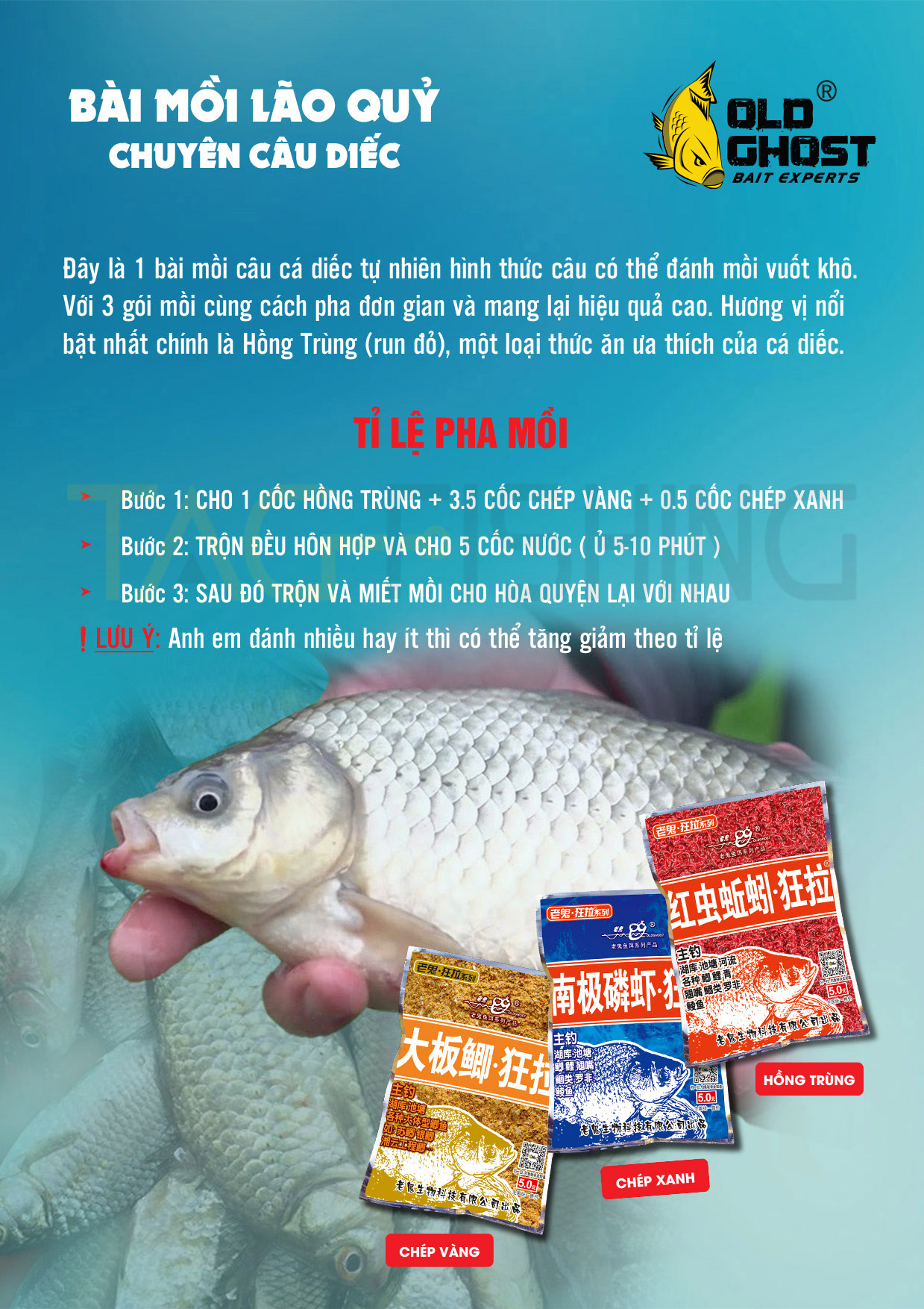 - Bài Mồi : 30% Hồng Trùng + 60% Chép Vàng Thơm + 10% Chép Xanh Tanh