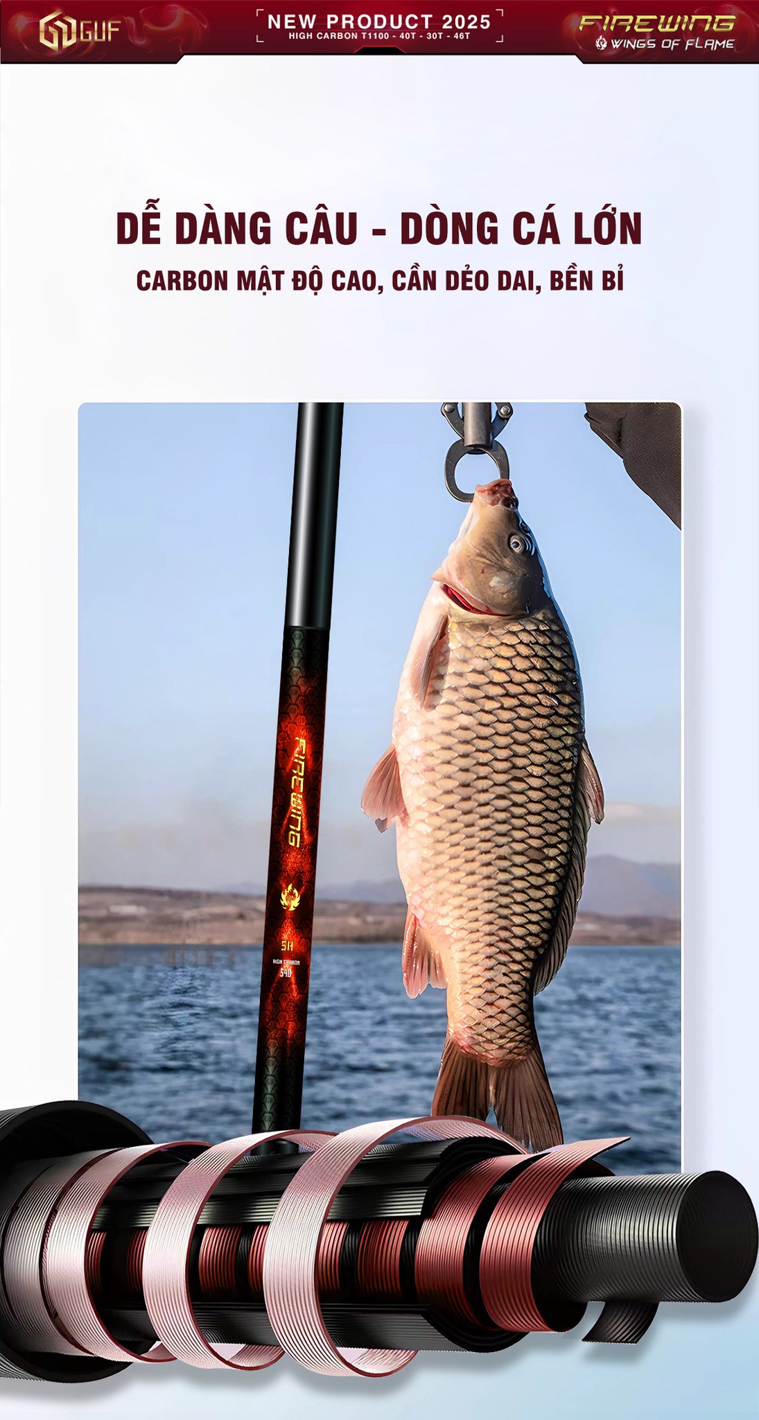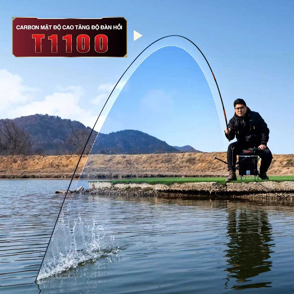 - Được kết hợp từ 3 loại vật liệu Carbon mật độ cao T1100 - 40T - 30T - 46T, xoắn chéo đa lớp giúp cần dẻo dai, chắc khỏe, bền bỉ.
