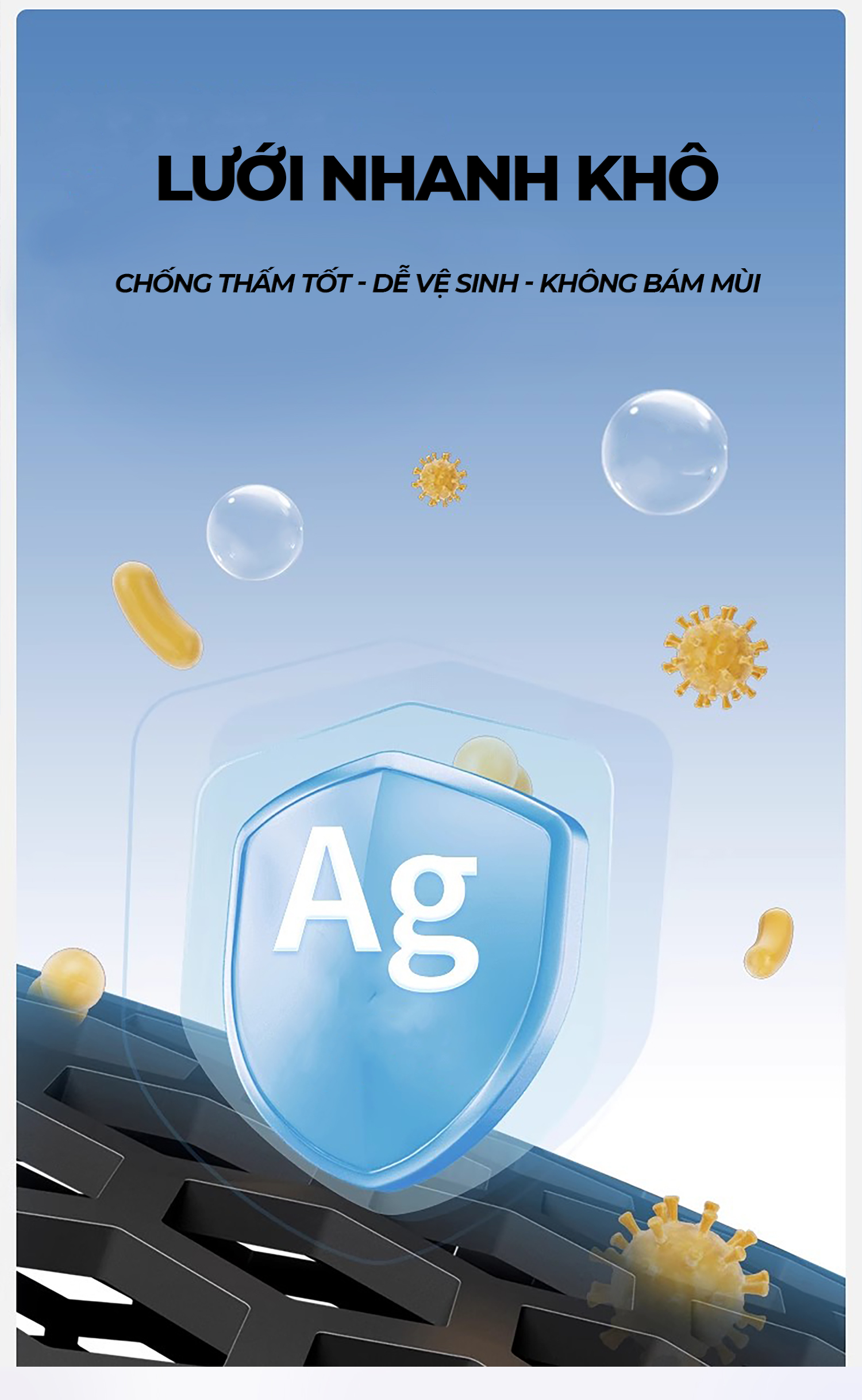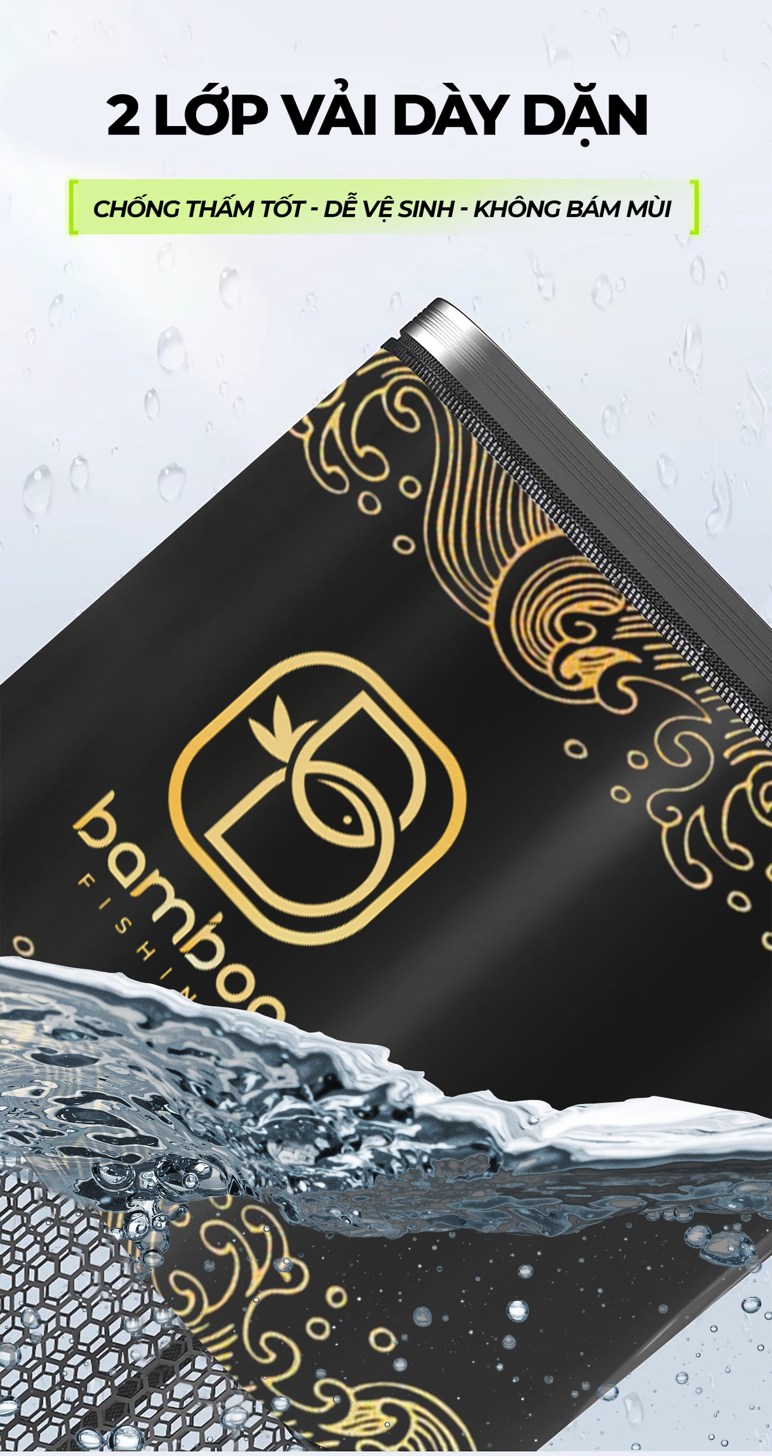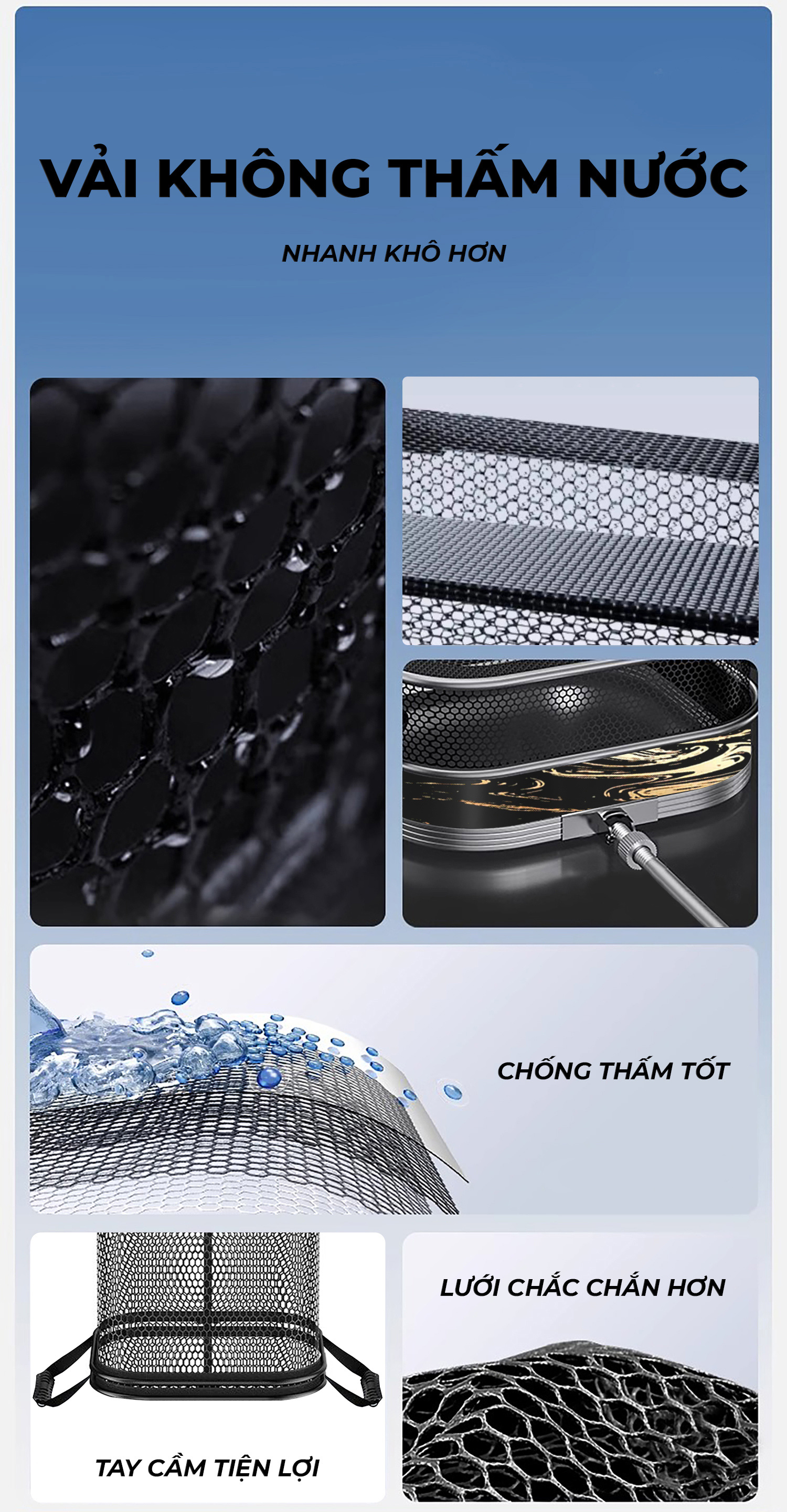 Chất liệu : Khung hợp kim, vải không thấm nước, lưới được tráng cao su chống thấm